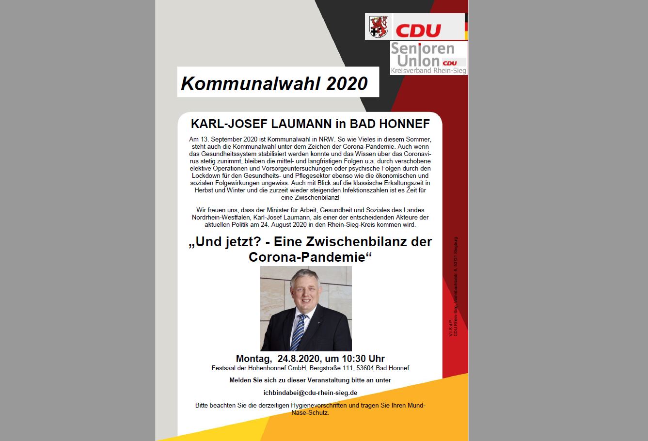 Wir freuen uns, dass der Minister für Arbeit, Gesundheit und Soziales des Landes Nordrhein-Westfalen, Karl-Josef Laumann, als einer der entscheidenden Akteure der aktuellen Politik am 24. August 2020 in den Rhein-Sieg-Kreis kommen wird.